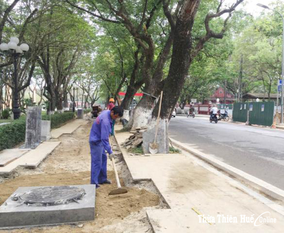 Vỉa hè đoạn từ quán cà phê Cây Si đến Bia Quốc Học hiện đang được đào xới để lắp đặt, thi công hệ thống cống thoát nước. Một đoạn ngắn đã hoàn thành, hiện đang hoàn trả mặt bằng, dầm đất để hạn chế sụt lún trước khi lát đá trả lại hiện trạng ban đầu. Đoạn gần Bia Quốc Học đang thi công cống thoát nước. Đáng nêu là, do việc đào xới ngay giữa vỉa hè, sát hàng cây long não cổ thụ có tuổi thọ hơn 100 năm và một số loại cây lâu năm khác khiến rất nhiều rễ cám của cây bị đứt. Có cây bày rễ nhánh bắt qua vỉa hè, vị trí đào khá gần gốc khiến người dân lo lắng đến sự phát triển, sinh trưởng của cây.