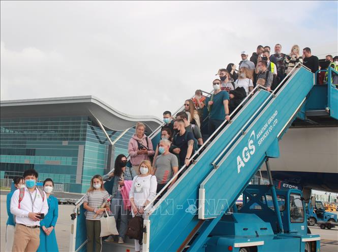 226 khách du lịch Nga có "hộ chiếu vaccine" đến Khánh Hòa trên chuyến bay số hiệu ZF743 của hãng hàng không Azur Air. Ảnh: Phan Sáu/TTXVN