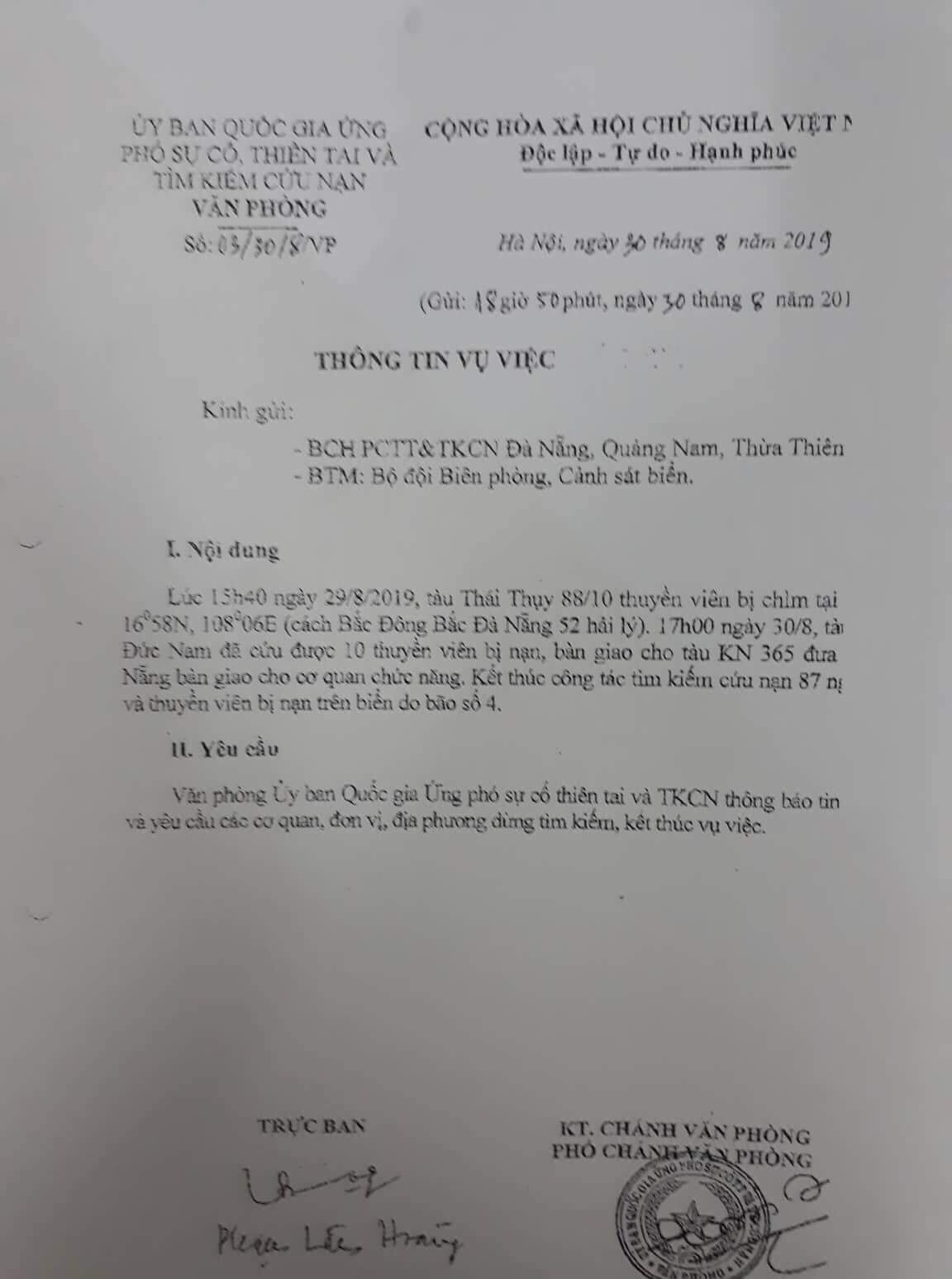 Theo đó, vào khoảng 17 giờ ngày 30/8, tàu hàng Đức Nam 1 trên hành trình trở về Hải Phòng qua vùng biển Quảng Trị đã tìm thấy 10 thuyền viên tàu Thái Thuỵ 88 khi đang trôi dạt ở vùng biển tỉnh Quảng Trị cách bờ hơn 80km. Sau đó, tàu Đức Nam 01 bàn giao các thuyền viên trên cho tàu KN 365 gần đó để tiếp tục hành trình. 10 thuyền viên được khám sức khỏe, cấp phát áo quần, dinh dưỡng. Các thuyền viên sẽ tiếp tục được đưa vào Đà Nẵng để bàn giao cho các cơ quan chức năng. Văn phòng Ủy ban Quốc gia ứng phó sự cố TT&TKCN thông báo tin và yêu cầu các cơ quan, đơn vị, địa phương dừng tìm kiếm, kết thúc vụ việc.
