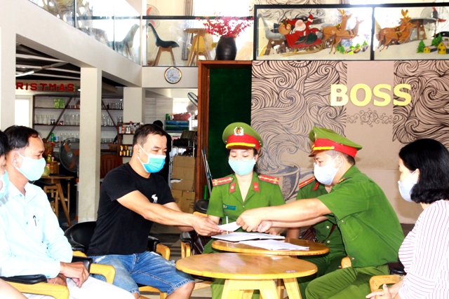 Công an TX. Hương Thủy thông báo với một chủ quán cà phê về việc tạm đóng cửa các quán cà phê trên địa bàn để phòng, chống dịch COVID-19