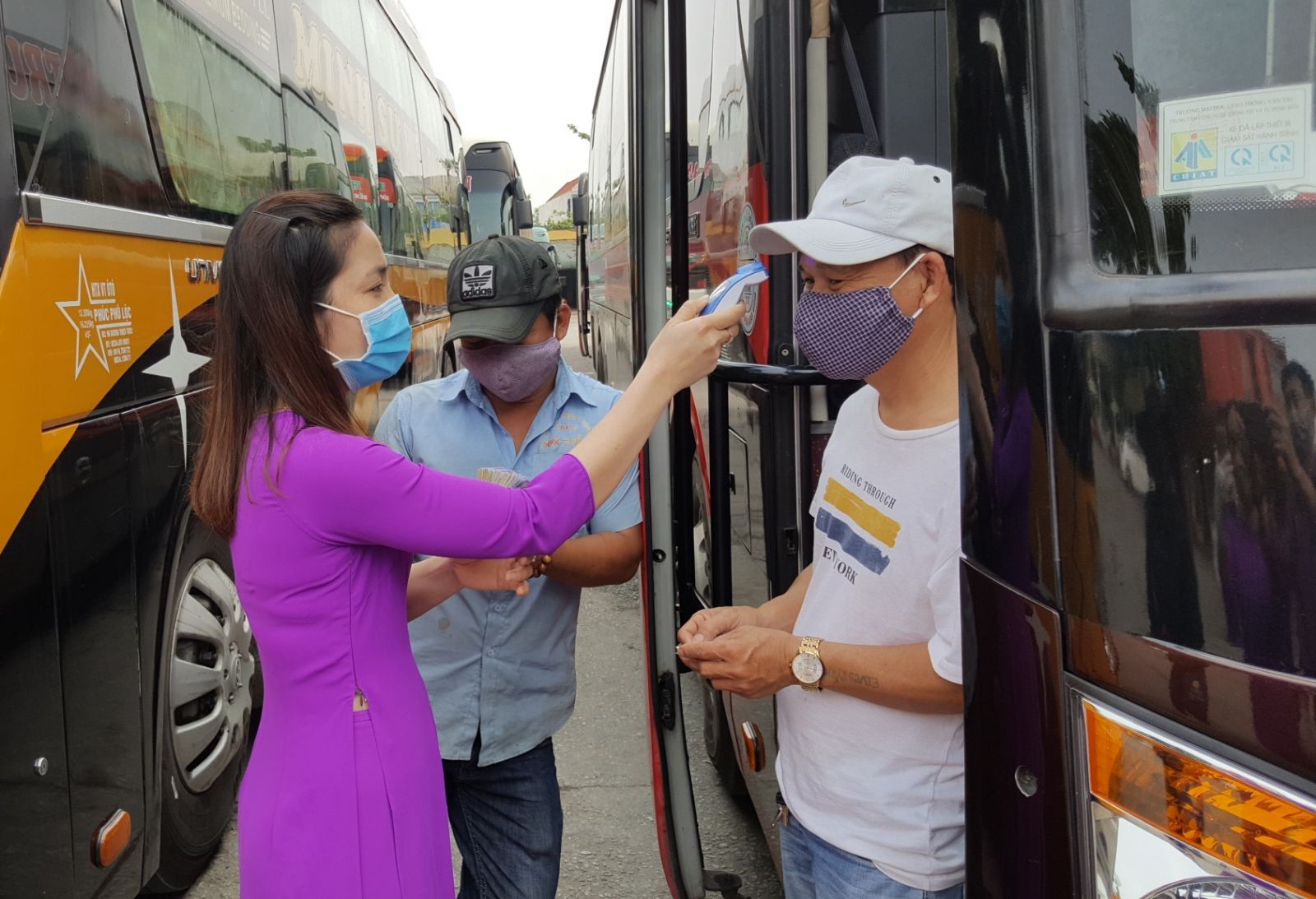 Kiểm tra đo thân nhiệt cho hành khách xuống và lên xe tại Bến xe phía Nam TP. Huế