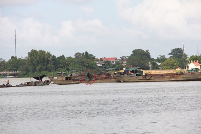 Lực lượng CSGT xuất hiện tại một thuyền khai thác cát trái phép chiều 6/11 (khoanh đỏ)