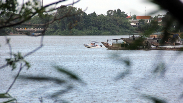 Tại thời điểm chúng tôi có mặt, khu vực bãi bồi Lương Quán xuất hiện ca nô của lực lượng CSGT đường thủy mang số hiệu CA75-0016 chở theo 4 người, trong đó có 3 người mang sắc phục của lực lượng CSGT. Chiếc ca nô này khi đến giữa sông đã di chuyển đến khu vực các đò khai thác cát rồi sau đó rời đi.