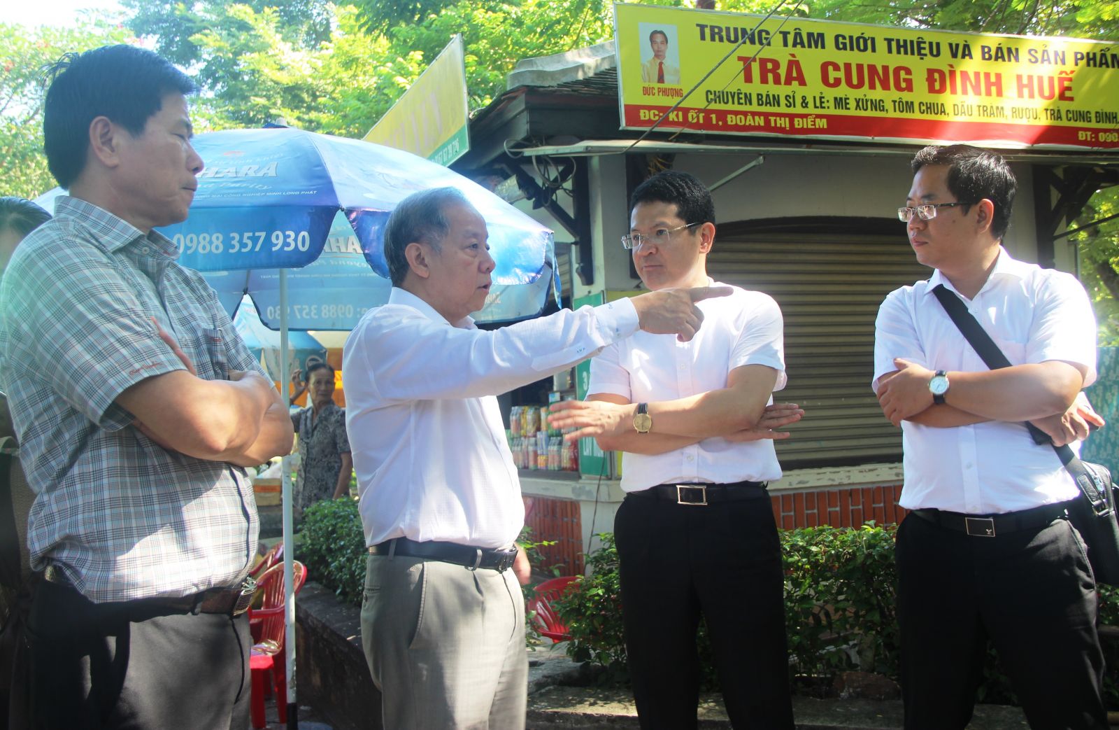 Chủ tịch UBND tỉnh Phan Ngọc Thọ trao đổi với lãnh đạo Phòng Quản lý Đô thị TP. Huế (bên trái) về nhiều điểm bất hợp lý trong xây dựng đê kè hai bên kênh Phát Lát