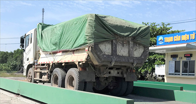 Tại khu vực cảng Thuận An, các xe không những nâng chiều cao kích thước thùng từ 0,3-0,5 m mà còn chở hàng tràn be, một số che chắn không kỹ càng gây rơi vãi trên đường. Cụ thể, xe tải BKS 75C-032… của DNTN T.L sau khi bốc đầy hàng ở bến chạy lên bàn cân.