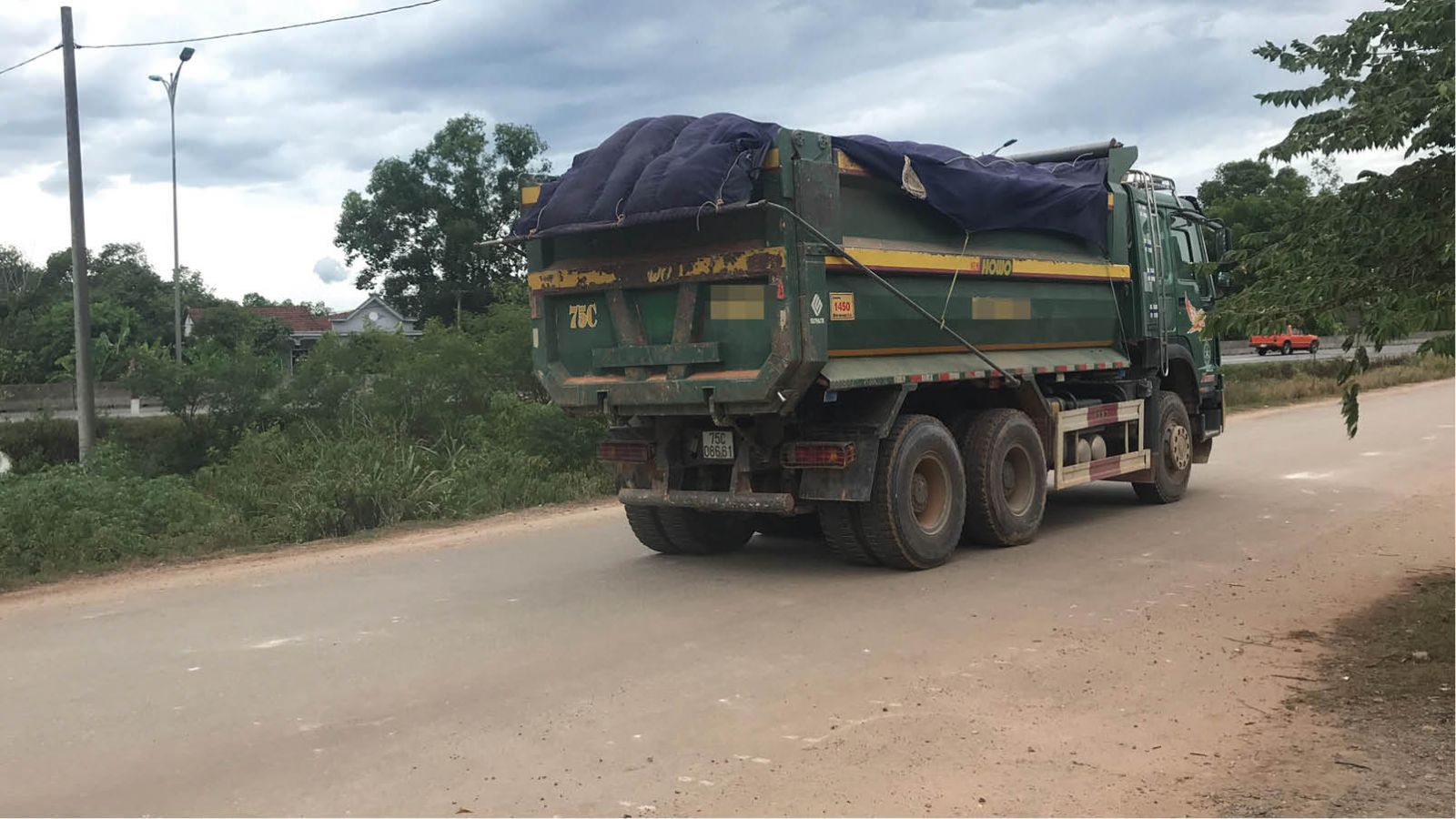 Ghi nhận của PV, từ tuyến Quốc lộ 1A cũ, hàng ngày có hàng trăm lượt phương tiện mang logo “Bảo Thái” ra vào khu vực này với các xe chở “có ngọn” tràn ben, thùng, che chắn bạt sơ sài. Đất đá rơi vãi trên đoạn tuyến quốc lộ cũ này, khiến người dân hai bên đường phải “gánh đủ”. Cụ thể, xe mang BKS 75C.086…, 75C.098…, sau khi chạy vòng từ Quốc lộ 1A xuống khu mỏ lấy đất, với tốc độ nhanh qua khu vực thôn Đông Lâm. Từ đoạn nằm dưới cầu vượt đường sắt Bắc - Nam, bụi tung mịt mù. Các xe này kích thước thùng của nhà sản xuất lần lượt là 0,95m và 1,05m, nhưng đã được “độ” lên cao khoảng 1,5m, chở đất gây rơi vãi trên đường.