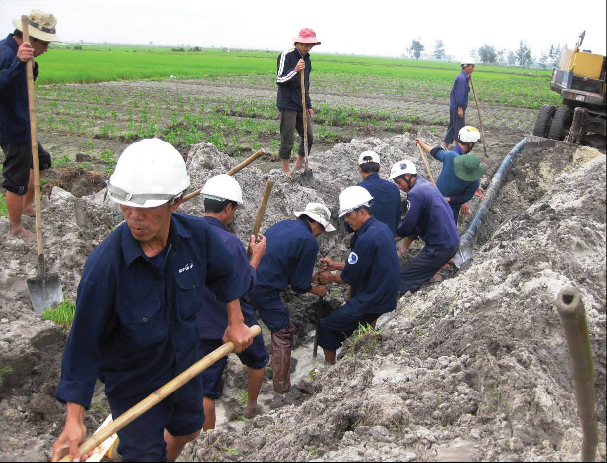 Tại HueWACO, VHDN là tăng cường phủ sóng nước sạch đến vùng sâu, vùng xa. Trong ảnh: Lắp đặt hệ thống nước đến vùng bãi ngang Quảng Điền