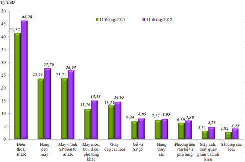 Trị giá xuất khẩu 10 nhóm hàng lớn nhất trong 11 tháng đầu năm 2018 so với 11 tháng đầu năm 2017
