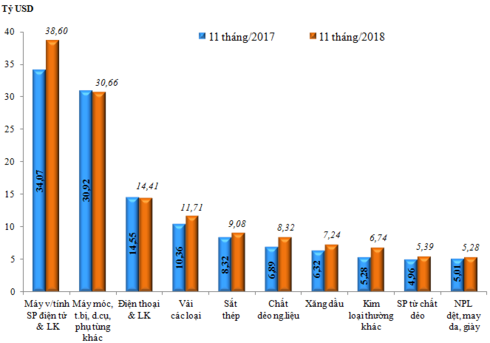 Kim ngạch hàng hóa nhập khẩu 11 tháng ước tính đạt 216,82 tỷ USD, tăng 12,4% so với cùng kỳ năm trước, trong đó một số mặt hàng có giá trị kim ngạch nhập khẩu lớn: Điện tử, máy tính và linh kiện đạt 38,7 tỷ USD, tăng 13,6% so với cùng kỳ năm trước; máy móc thiết bị, dụng cụ phụ tùng đạt 30,7 tỷ USD, giảm 0,7%; điện thoại và linh kiện đạt 14,4 tỷ USD, giảm 0,8%; vải đạt 11,8 tỷ USD, tăng 13,6%...