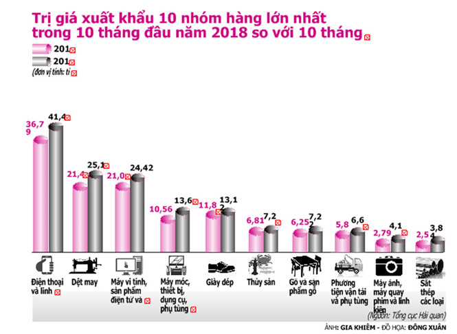 Trị giá xuất khẩu 10 nhóm hàng lớn nhất trong 10 tháng đầu năm 2018 so với 10 tháng đầu năm 2017