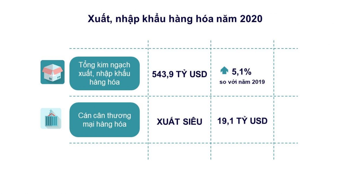 Như vậy, cán cân thương mại hàng hóa năm 2020 xuất siêu khoảng 19,1 tỷ USD, mức cao nhất trong 5 năm liên tiếp xuất siêu kể từ năm 2016. Đây là kết quả ấn tượng trong bối cảnh nền kinh tế trong nước cũng như thế giới chịu tác động tiêu cực của dịch Covid-19 và sự đứt gãy thương mại toàn cầu.