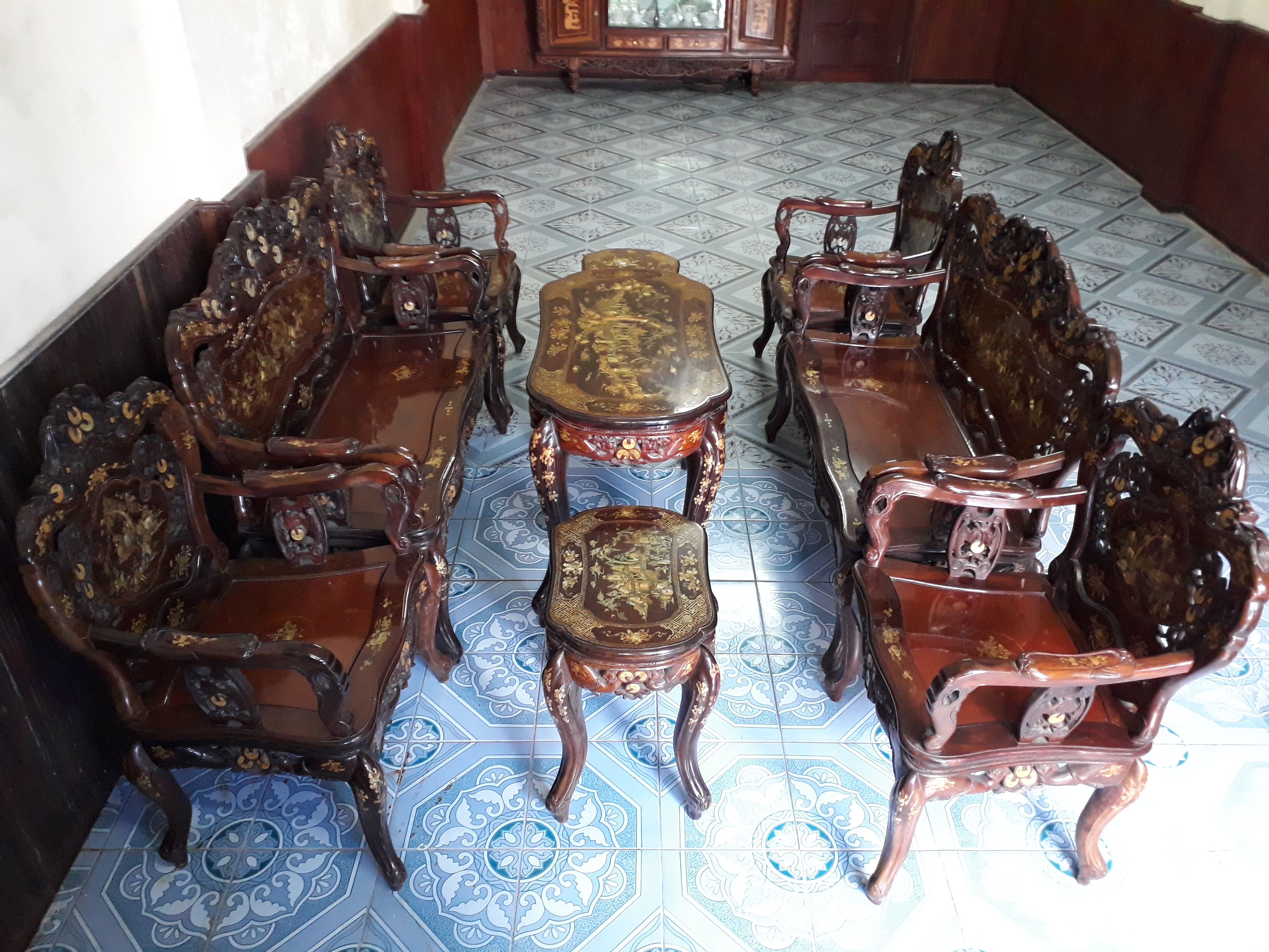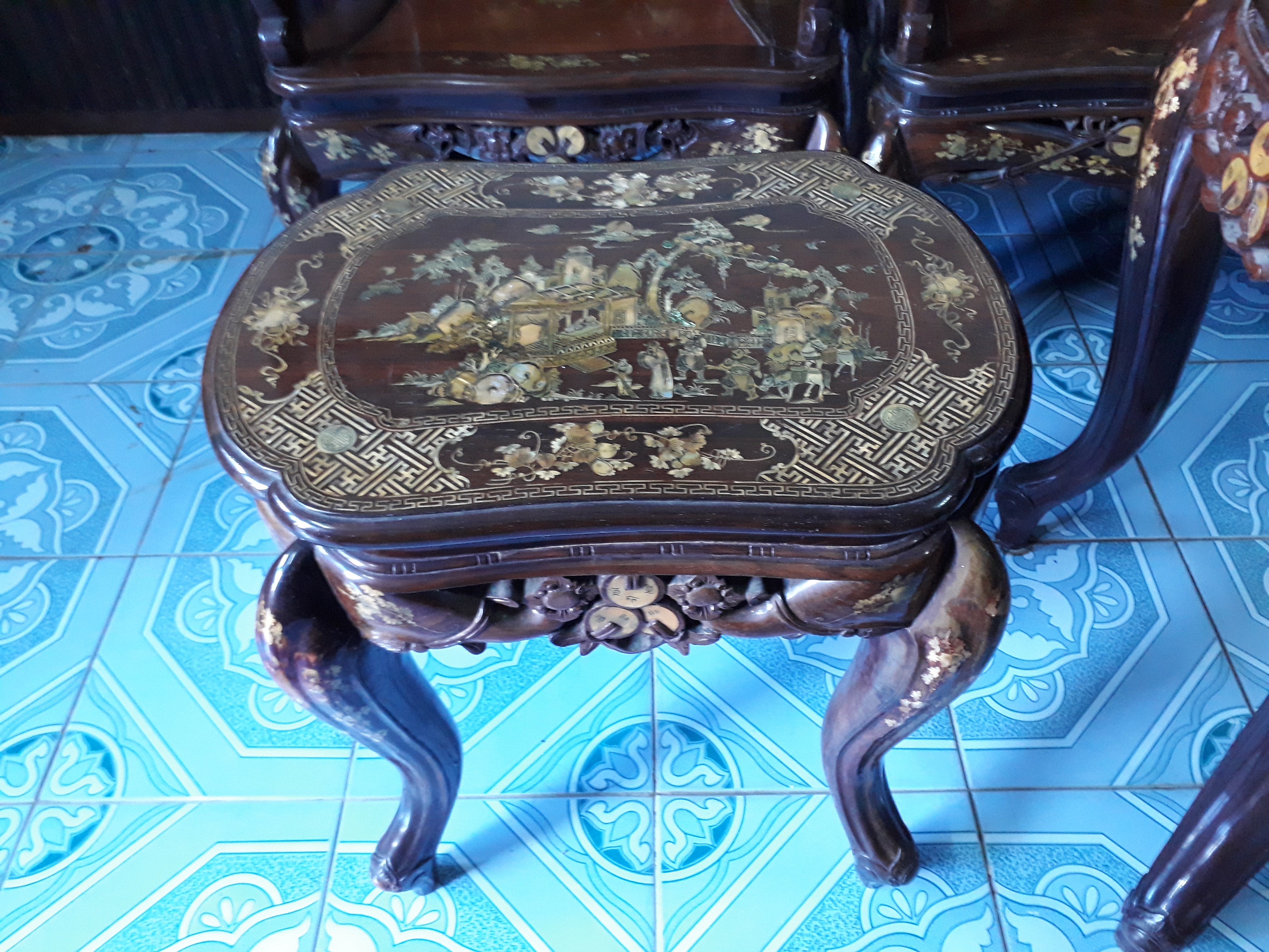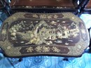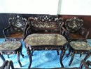 Cần bán 1 bộ bàn ghế Louis gỗ trắc Gia Lai khảm xà cừ (Nội dung khảm Tam quốc diễn nghĩa)