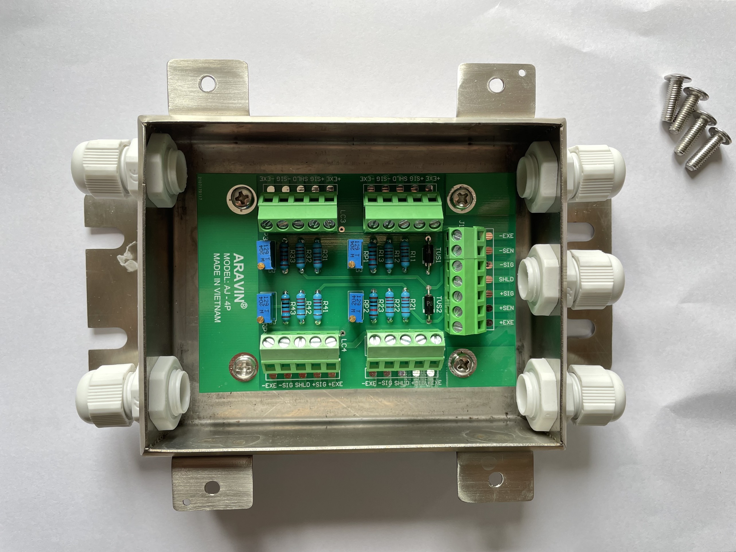 AJ-4P có 4 biến trở vi chỉnh tương ứng với 4 tín hiệu đầu vào từ load cell, cho phép người dùng hiệu chỉnh độ lệch của các góc.