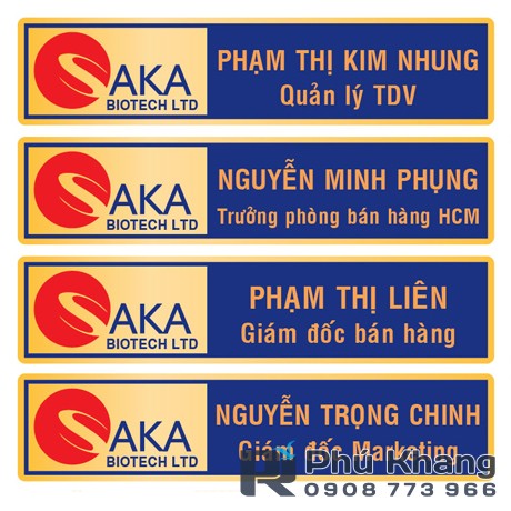 Công ty PHÚ KHANG 0908 773 966 – 0918 663 977 Trực tiếp sản xuất các mặt hàng bảng tên cài áo giá rẻ tại TpHCM – Bảng tên đồng mạ vàng hoặc mạ nikel – Bảng tên ăn mòn đổ màu – Bảng tên in offset Ngoài ra Cty còn sản xuất bảng tên nhân viên giá rẻ: – Bảng tên inox, bảng tên nhôm, bảng tên mica… Mọi chi tiết sản xuất bảng tên cài áo xin liên hệ: ———————————————- ĐẮC PHÚ Hotline: 0908 773 966 – 0918 663 977 Email: phukhangqt@gmail.com Email: dacphu077@gmail.com Web: 68gifts.com ———————————————- CTY TNHH Đầu Tư Sản Xuất Phát Triển Thương Mại PHÚ KHANG ĐC: 109/5/9 TX22 (Thạnh Xuân 22), P .Thạnh Xuân, Q.12 Skype: dacphu077