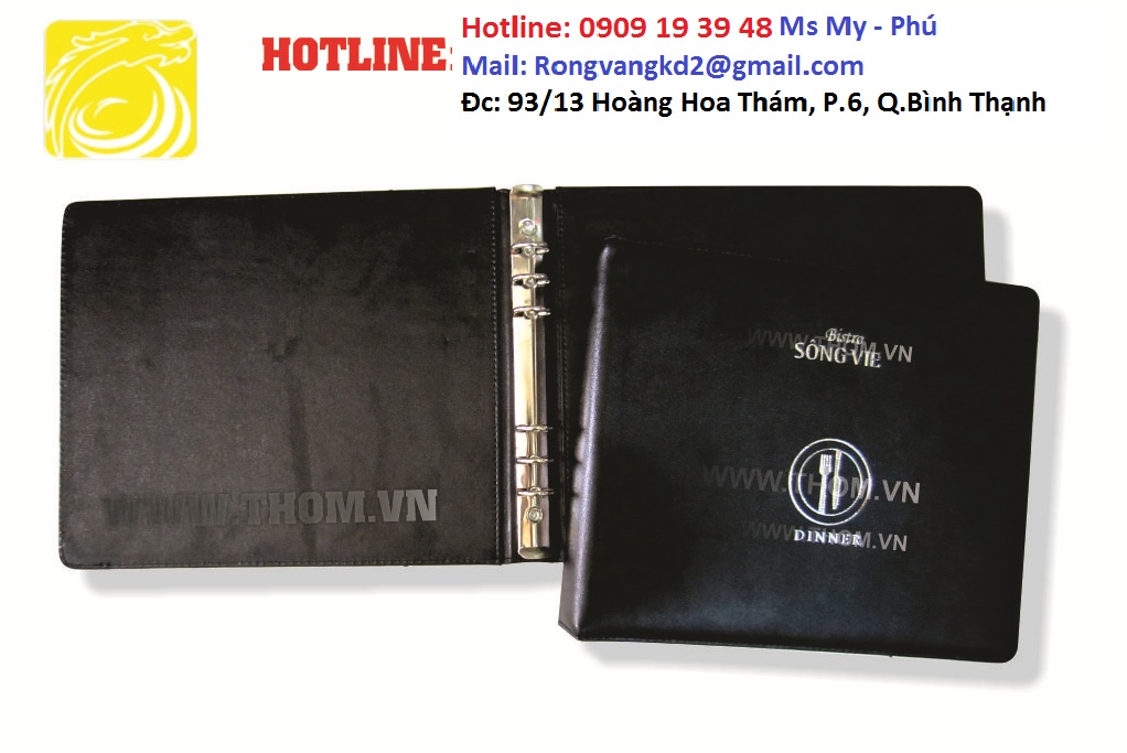 CTY RỒNG VÀNG / Sản xuất bìa simili – Bìa Menu – Bìa tính tiền – bìa đựng bằng – Ví namecard - ví nam – ví nữ - ví đựng hộ chiếu - ví du lịch.. Đ/c : 93/13 Hoàng Hoa Thám, P.6, Bình Thạnh, Tp.HCM Email: rongvangkd2@gmail.com https://www.facebook.com/cososanxuatbiasimili/ Website: www.Thom.vn (Tell, zalo, viber): 0909 19 39 48 Công Ty chúng tôi chuyên sản xuất các mặt hàng simili, da. Giả da..như: Bìa menu: khổ A3, A4, A5, Khổ theo yêu cầu khác Bìa tính tiền: khổ chuẩn Bìa note: gặp gắng nam châm, bút viết Bìa hồ sơ: bìa còng, ép.. Bìa trình ký: còng, gập.. Bìa nhựa trong đựng giấy tờ Nhận in ấn, ép logo theo yêu cầu - Bìa Menu , cuốn menu, quyển menu, menu nhà hàng, menu quán ăn, menu - Bìa Karaoke , bìa trình ký, bìa đựng hồ sơ, bìa tính tiền, bìa còng, bìa kẹp - Bìa bill Tính Tiền… - Sổ tay đóng còng, lò xo, đóng gáy - Sổ bìa da, simili, giấy, PU - Sản xuất bìa menu với chất liệu: simili, giả da, da thật,.. - in ấn, thiết kế theo yêu cầu khách hàng như ép nhủ, kép lụa logo, slogan.. ĐẶT BIỆT LÀ CÔNG TY CHUYÊN LÀM BÌA ĐỰNG BẰNG TỐT NGHIỆP CHO CÁC TRƯỜNG CAO ĐẲNG, ĐẠI HỌC TRÊN TOÀN QUỐC Như : Đại học Y Dược, Đại Học Bình Dương, Đại Học Hoa Sen, Đại Học Kinh Tế….. Chi tiết liên hệ: CTY RỒNG VÀNG / Sản xuất bìa simili – Bìa Menu – Bìa tính tiền – bìa đựng bằng – bìa Đ/c : 93/13 Hoàng Hoa Thám, P.6, Bình Thạnh, Tp.HCM Điện thoại: 08 38 41 0632 – fax: 08 38 41 0631 Email: rongvangkd2@gmail.com Website: www.Thom.vn Facebook: https://www.facebook.com/cososanxuatbiasimili/ (Tell, zalo, viber): 0909 19 39 48