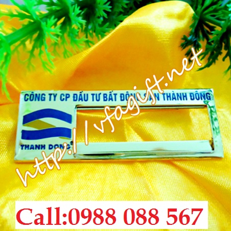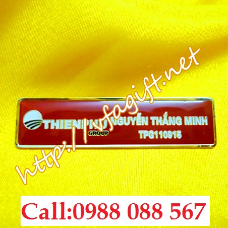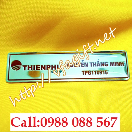Biển tên nhân viên hay còn gọi là biển tên công ty được sản xuất bằng công nghệ ăn mòn nội dung trên kim loại, sau đó sản phẩm được chuyển qua công đoạn mạ vàng. Sau khi xi mạ sản phẩm được đổ màu logo, tên bằng máy chuyên dụng. Sản phẩm được chuyển qua công đoạn phủ keo để tăng độ bóng và không bị ô xi hóa. Có ba dạng biển tên nhân viên chính ăn mòn từng tên, in tên hay tên được thay bằng giấy in nội dung thay đổi, mẫu mã đẹp, phong phú, sản xuất theo yêu cầu.