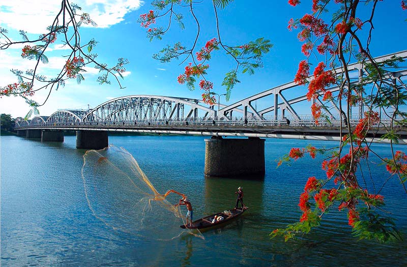 HDV sẽ đưa du khách dạo quanh thành phố Huế city thơ mộng, ghé thăm Sông Hương, cầu Tràng Tiền. Trên xe HDV sẽ giới thiệu thêm về những địa danh nổi tiếng khác cũng trải qua nhiều thăng trầm gắn liền với lịch sử đầy biến động.Hình ảnh sông Hương và Cầu Tràng Tiền – Tour Huế 1 ngày