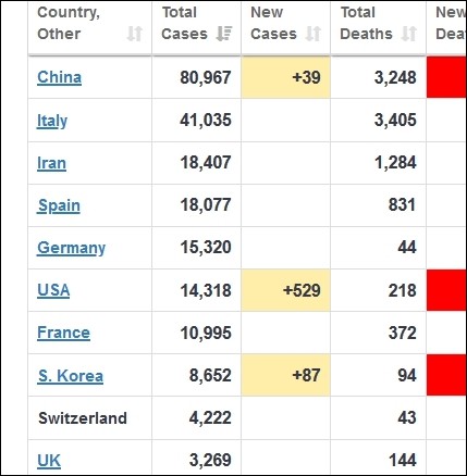 Đến 9h57 ngày 20/3/2020 (giờ Việt Nam) có 10 quốc gia ghi nhận số ca nhiễm virus SARS-CoV-2 gây bệnh Covid-19 nhiều nhất thế giới theo bảng số liệu mới của trang web thống kê toàn cầu Worldometer (từ cao xuống thấp) như sau: (1) Trung Quốc, (2) Italy, (3) Iran, (4) Tây Ban Nha, (5) Đức, (6) Mỹ, (7) Pháp, (8) Hàn Quốc, (9) Thụy Sĩ, và (10) Anh.