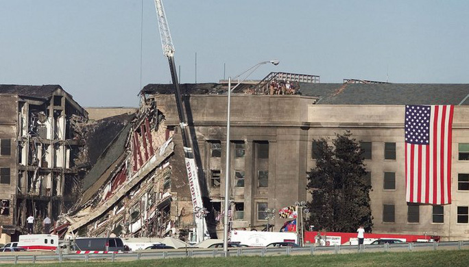 Khu vực phía Nam của Lầu Năm Góc bốc cháy sau khi bị máy bay đâm vào. Ảnh: AP