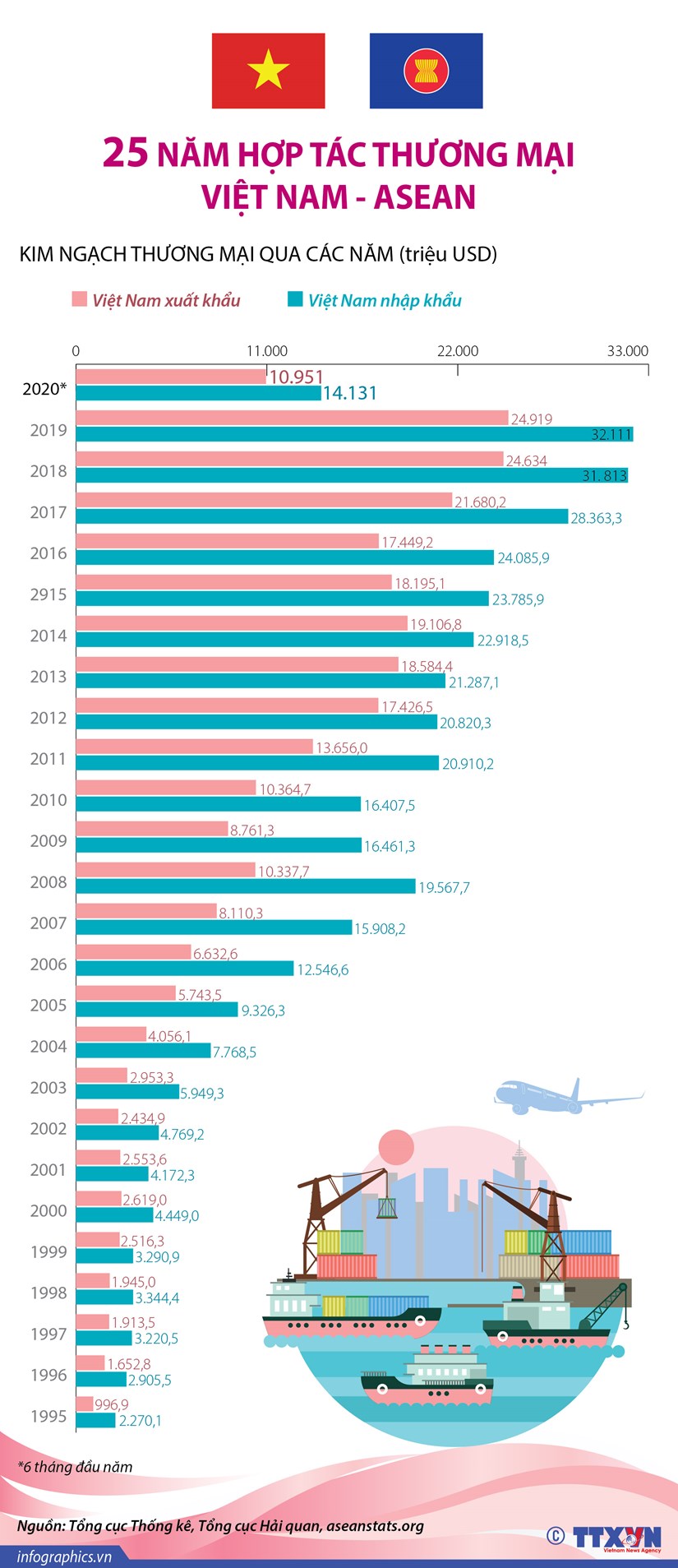 Sau 25 năm kể từ khi Việt Nam chính thức trở thành thành viên của ASEAN, kim ngạch trao đổi thương mại giữa Việt Nam với các nước ASEAN đã tăng lên nhanh chóng, đóng góp đáng kể vào sự phát triển kinh tế của Việt Nam cũng như các nước thành viên của Hiệp hội.
