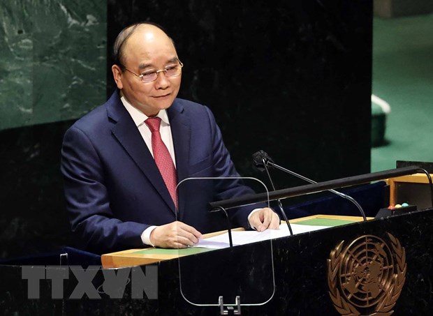 Chủ tịch nước Nguyễn Xuân Phúc phát biểu tại Phiên thảo luận Cấp cao Đại hội đồng Liên Hiệp quốc lần thứ 76. (Ảnh: Thống Nhất/TTXVN)