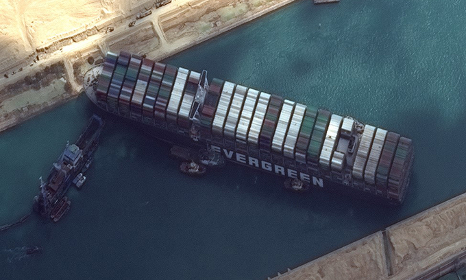 Tàu container cỡ lớn Ever Given, tổng trọng tải hơn 200.000 tấn, đâm chéo vào bờ kênh đào Suez và mắc cạn sáng 24/3 khi di chuyển từ Biển Đỏ tới Địa Trung Hải. Con tàu gần như xoay ngang, bịt kín tuyến hàng hải qua kênh đào Suez, khiến mọi hoạt động di chuyển qua kênh đào phải dừng.