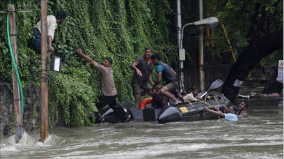 Lực lượng cứu hộ cố gắng giải cứu một người đàn ông bị mắc kẹt ở Chennai, Ấn Độ hôm 3/12. Ảnh: AP