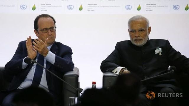 Tổng thống Pháp Francois Hollande (trái) và Thủ tướng Ấn Độ Narendra Modi tại Hội nghị về biến đổi khí hậu của Liên Hợp Quốc tháng 11/2015. Ảnh: Reuters