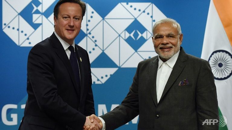 Thủ tướng Anh David Cameron (trái) bắt tay Thủ tướng Ấn Độ Narendra Modi trong một cuộc họp song phương bên lề Hội nghị thượng đỉnh G20 tại Trung tâm Hội nghị và Triển lãm Brisbane (BCEC) ở Brisbane. Ảnh: AFP.