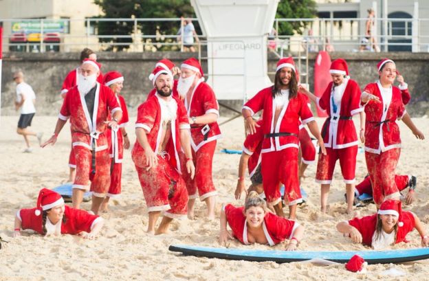 320 ông già, bà già Noel lập kỷ lục thế giới về số người tham gia lễ hội lướt sóng. Ảnh: BBC
