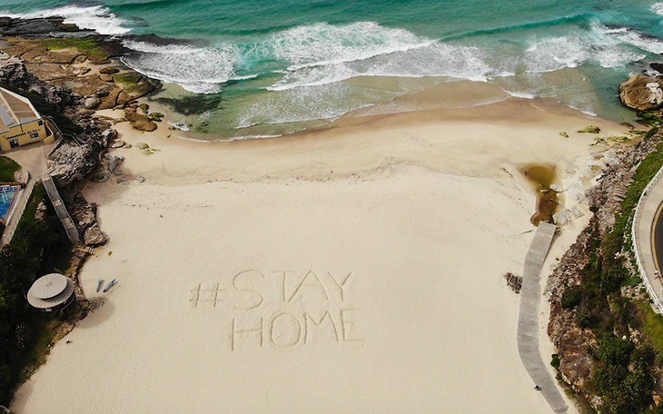 Lời kêu gọi ở nhà để tuân thủ quy định giãn cách xã hội được viết trên một bãi biển ở Sydney. Ảnh: Getty