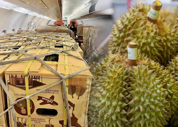 | Lô sầu riêng tươi được vận chuyển từ Thái Lan đến sân bay quốc tế Bạch Vân Quảng Châu, thành phố Quảng Châu, tỉnh Quảng Đông, Trung Quốc - Ảnh: MATICHON |