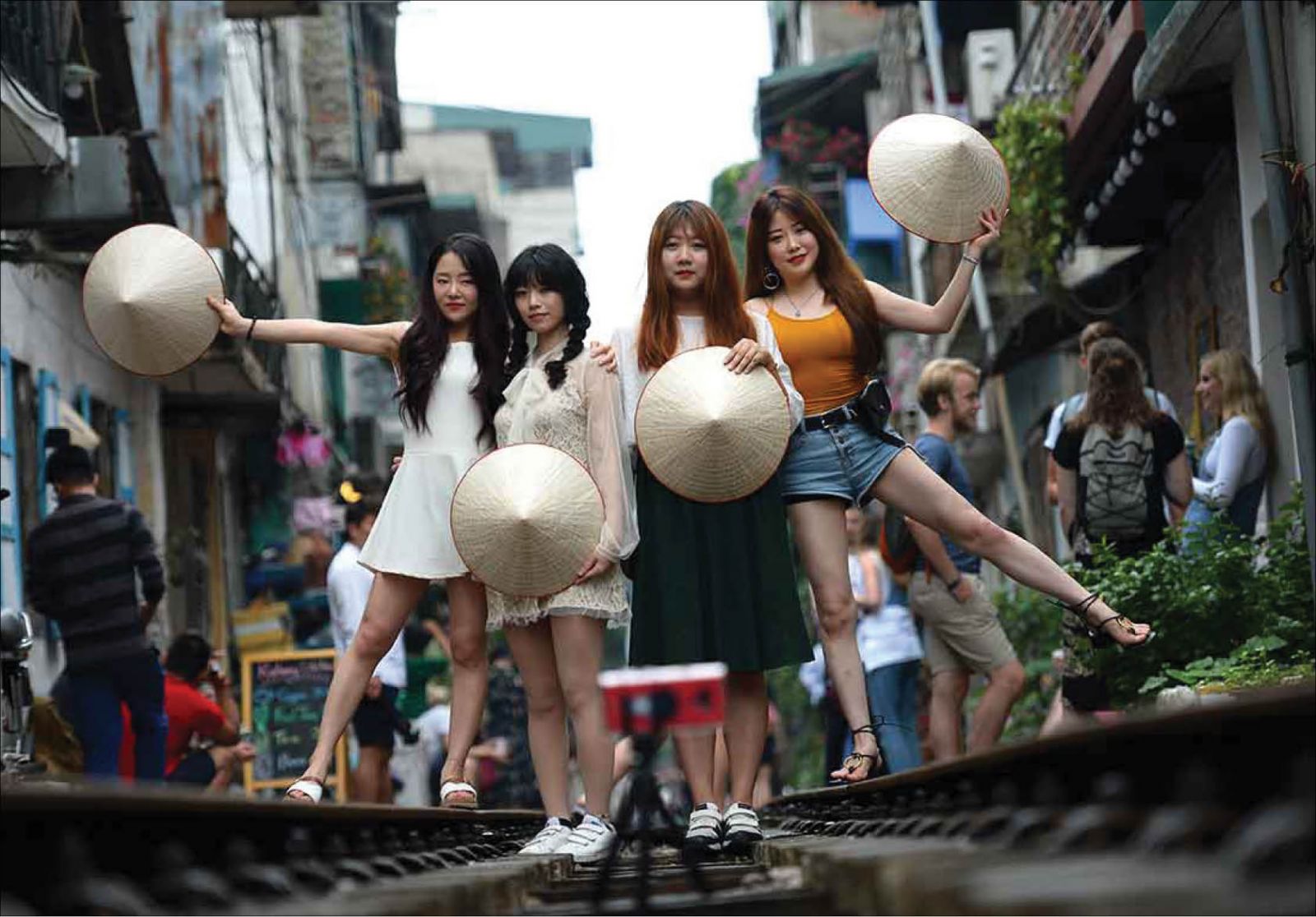 Du khách nước ngoài mang nón lá, chụp ảnh tại 1 đoạn đường ray xe lửa ở Hà Nội. Ảnh: AFP