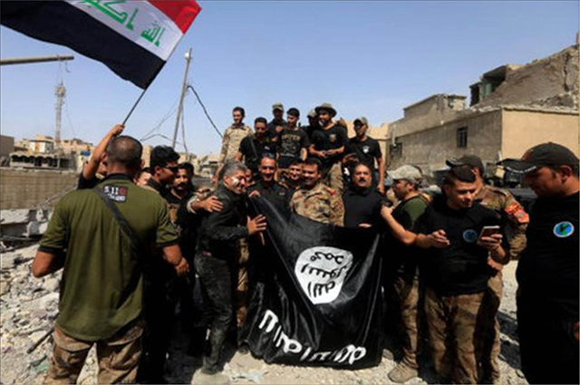 Lực lượng chống khủng bố Iraq cầm lá cờ IS sau khi bị kéo xuống tại thành cổ Mosul. Ảnh: Reuters