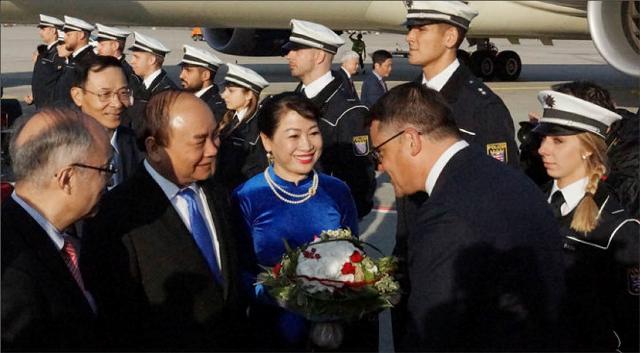 Thủ tướng Nguyễn Xuân Phúc và Phu nhân tại sân bay Frankfut, Đức, trước khi tham dự Hội nghị G20. Ảnh: Thanhnien
