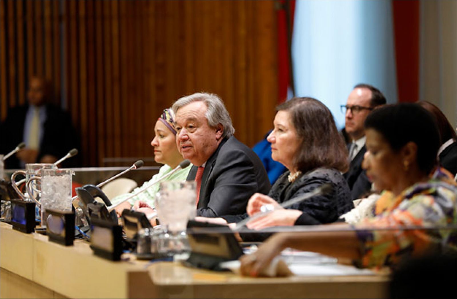 Tổng thư ký LHQ Antonio Guterres (giữa) tại khoá họp lần thứ 62 của Ủy ban Địa vị Phụ nữ LHQ (CSW62). Ảnh: UN Women