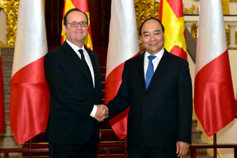 | Tổng thống Pháp Francois Hollande (trái) bắt tay Thủ tướng Nguyễn Xuân Phúc (phải) trong chuyến thăm Việt Nam tháng 9/2016. Trong 5 năm qua, chính quyền của ông Hollande đặc biệt quan tâm củng cố quan hệ với các nước châu Á, trong đó có Việt Nam. |