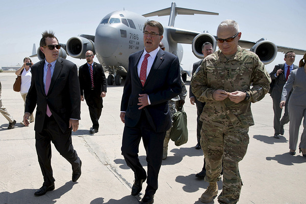 Bộ trưởng Quốc phòng Mỹ Ash Carter (giữa) bất ngờ tới Iraq ngày 16/12/2015. Ảnh:Reuters.