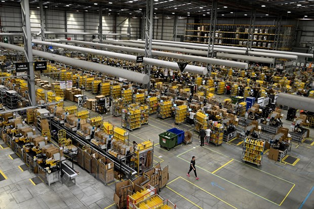 Hàng hóa đang được đóng gói tại một trung tâm dịch vụ của Công ty Thương mại Điện tử Amazon. Ảnh minh họa: AFP/TTXVN