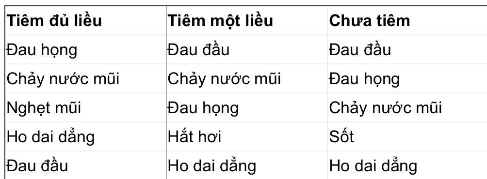 Theo đó, các nhà nghiên cứu đã phát hiện rằng đối với những người tham gia khảo sát ở cả ba nhóm (tiêm đầy đủ, tiêm một liều và chưa tiêm), 4 trong số 5 triệu chứng phổ biến nhất đều giống nhau, gồm: đau họng, chảy nước mũi, ho dai dẳng và đau đầu.