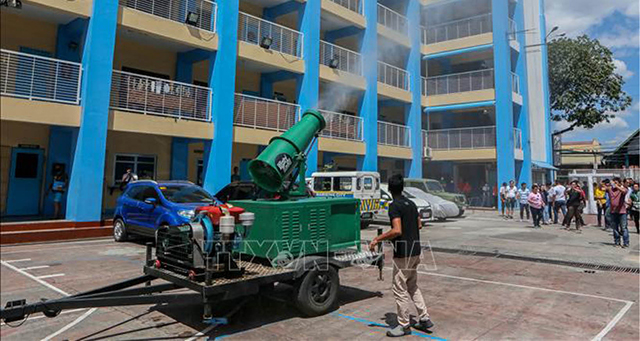 Một trường học ở Philippines được thực hiện phun khử trùng nhằm ngăn chặn sự lây lan của dịch bệnh COVID-19. Ảnh minh hoạ: THX/TTXVN