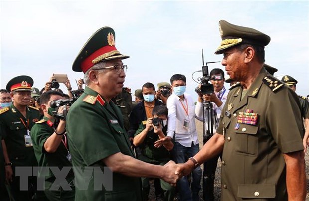 Thượng tướng Nguyễn Chí Vịnh, Thứ trưởng Bộ Quốc phòng Việt Nam gặp gỡ Phó Thủ tướng Campuchia Samdech Pichey Sena Tea Banh tại biên giới hai nước. Ảnh: Vũ Hùng/TTXVN