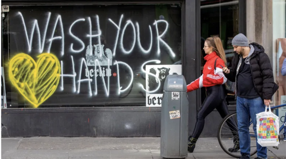 Lời kêu gọi hãy rửa tay xuất hiện trên một cửa hàng bị đóng cửa - Ảnh: AFP