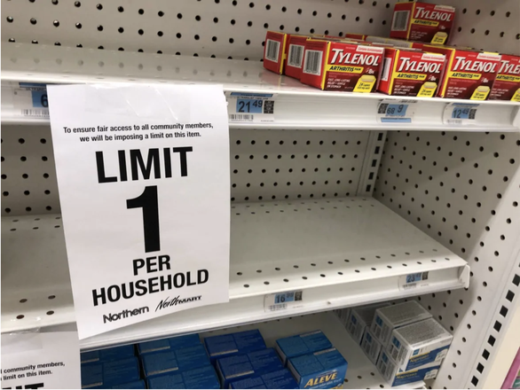 Siêu thị North Mart ở thành phố Iqaluit ở Canada giới hạn mỗi gia đình chỉ mua 1 sản phẩm xà bông, thuốc trị cúm hay chai nước rửa tay - Ảnh: CBC