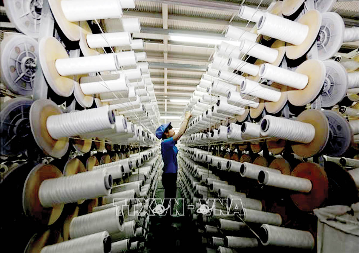 Công nhân làm việc trong một dây chuyền sản xuất vải nhựa plastics. Ảnh minh họa: TTXVN