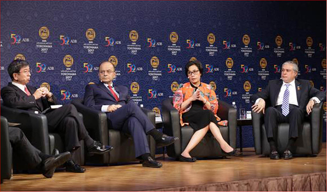 Chủ tịch ADB (trái) và các Bộ trưởng Tài chính Ấn Độ, Indonesia và Pakistan trong cuộc họp tại Yokohama, Nhật Bản. Ảnh: Nikkei