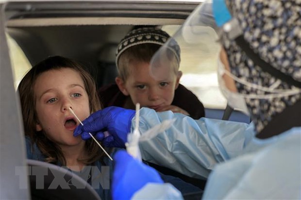 Nhân viên y tế Israel lấy mẫu xét nghiệm COVID-19 cho trẻ em tại Jerusalem. (Ảnh: AFP/TTXVN)