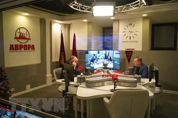 Người dẫn chương trình Georgyi Fedorov, Giám đốc phát triển chiến lược hãng thông tấn Avrora và chuyên gia chính trị thời sự quốc tế Nga, Chủ tịch Hội đồng chuyên gia Quỹ Nghiên cứu khóa học Á-Âu, ông Grygory Trofimchuk, trong chương trình bình luận về Biển Đông vừa được phát sóng trên kênh thông tin Avrova của Nga. Ảnh: Quang Vinh/TTXVN