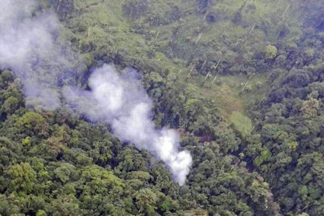 Hình ảnh do cảnh sát Colombia cung cấp cho thấy khói cuồn cuộn bốc lên từ khu vực chiếc trực thăng Blackhawk rơi xuống - Ảnh: AFP