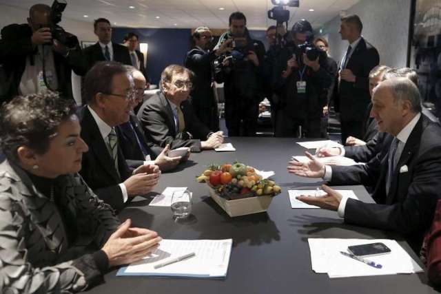 Ngoại trưởng Pháp Laurent Fabius (phải) thảo luận với đại diện LHQ trong COP21. Ảnh: Reuters